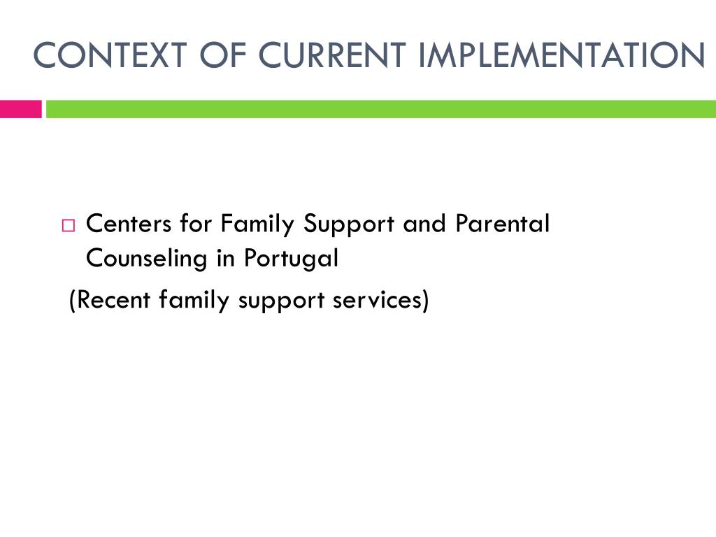 CONTEXT OF CURRENT IMPLEMENTATION • Centers for Family Support and Parental Counseling in Portugal (Recent family support services)