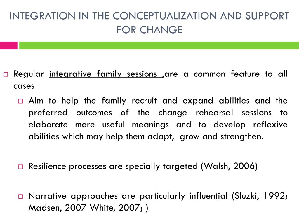 INTEGRATION IN THE CONCEPTUALIZATION AND SUPPORT FOR CHANGE • Regular integrative family sessions ,are a common feature to all cases • Aim to help the family recruit and expand abilities and the preferred outcomes of the change rehearsal sessions to elaborate more useful meanings and to develop reflexive abilities which may help them adapt, grow and strengthen. • Resilience processes are specially targeted (Walsh, 2006) • Narrative approaches are particularly influential (Sluzki, 1992; Madsen, 2007 White, 2007; )