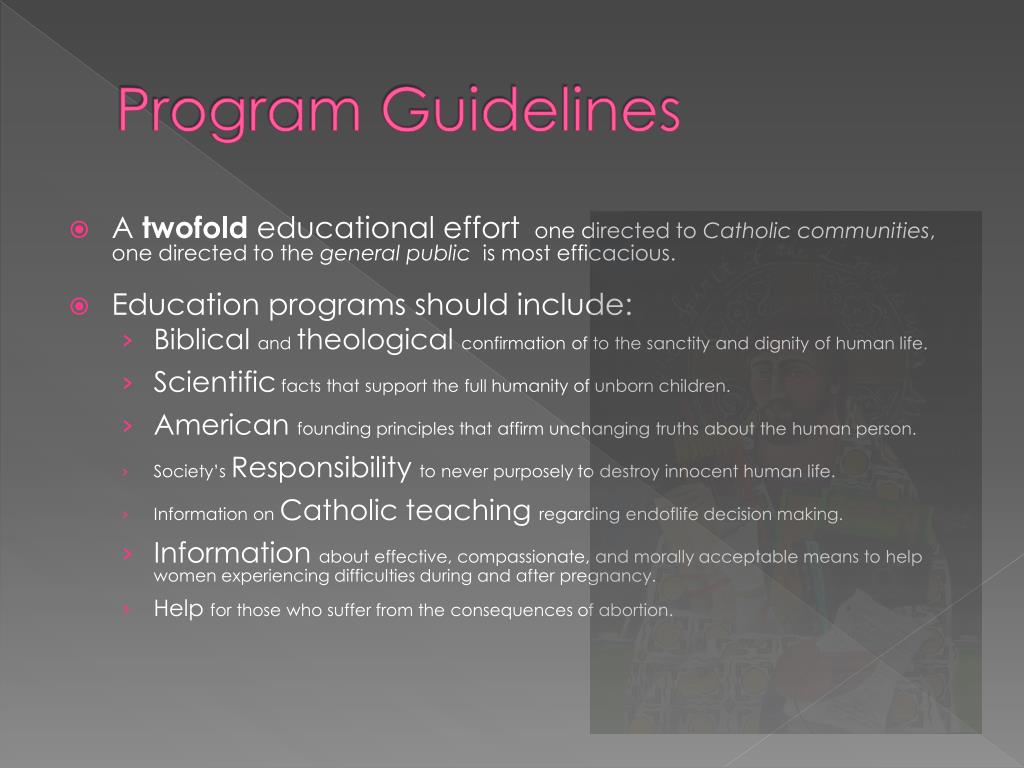 Program Guidelines • A twofold educational effort one directed to Catholic communities, one directed to the general public is most efficacious. • Education programs should include: • Biblical and theological confirmation of to the sanctity and dignity of human life. • Scientific facts that support the full humanity of unborn children. • American founding principles that affirm unchanging truths about the human person. • Society’s Responsibility to never purposely to destroy innocent human life. • Information on Catholic teaching regarding endoflife decision making. • Information about effective, compassionate, and morally acceptable means to help women experiencing difficulties during and after pregnancy. • Help for those who suffer from the consequences of abortion.