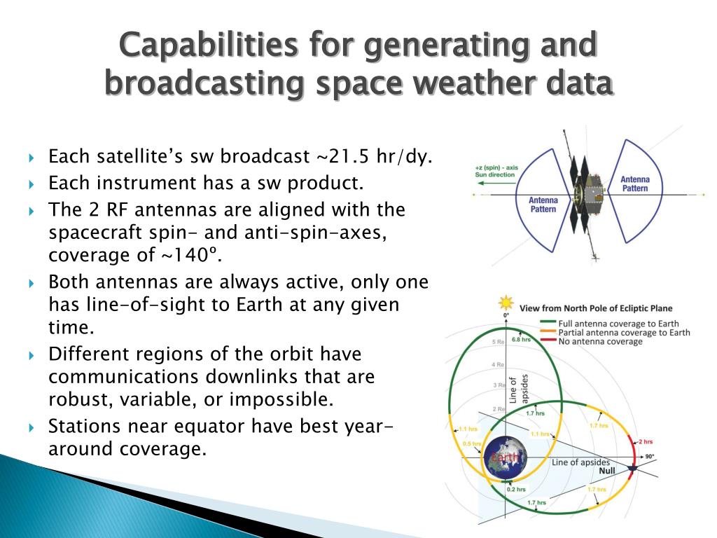 Capabilities for generating and broadcasting space weather data • Each satellite’s sw broadcast ~21.5 hr/dy. • Each instrument has a sw product. • The 2 RF antennas are aligned with the spacecraft spin- and anti-spin-axes, coverage of ~140º. • Both antennas are always active, only one has line-of-sight to Earth at any given time. • Different regions of the orbit have communications downlinks that are robust, variable, or impossible. • Stations near equator have best year-around coverage.
