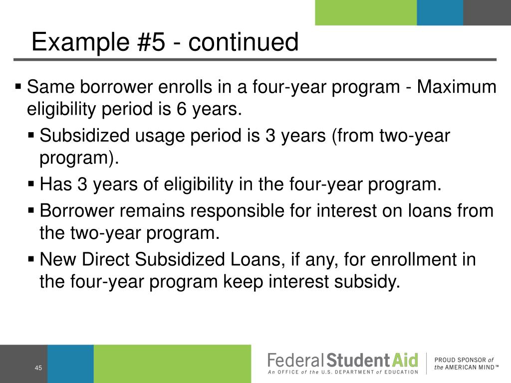 Example #5 - continued • Same borrower enrolls in a four-year program - Maximum eligibility period is 6 years. • Subsidized usage period is 3 years (from two-year program). • Has 3 years of eligibility in the four-year program. • Borrower remains responsible for interest on loans from the two-year program. • New Direct Subsidized Loans, if any, for enrollment in the four-year program keep interest subsidy.