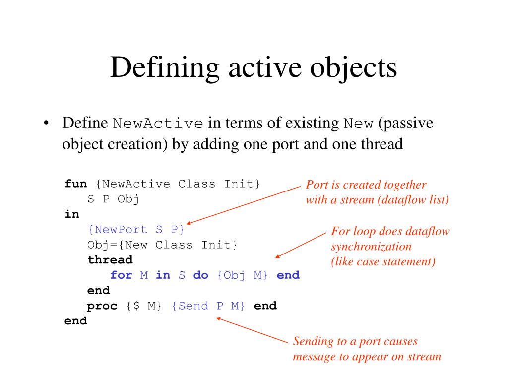 Defining active objects • Define NewActive in terms of existing New (passive object creation) by adding one port and one thread fun {NewActive Class Init} S P Obj in {NewPort S P} Obj={New Class Init} thread for M in S do {Obj M} end end proc {$ M} {Send P M}end end Port is created together with a stream (dataflow list) For loop does dataflow synchronization (like case statement) Sending to a port causes message to appear on stream