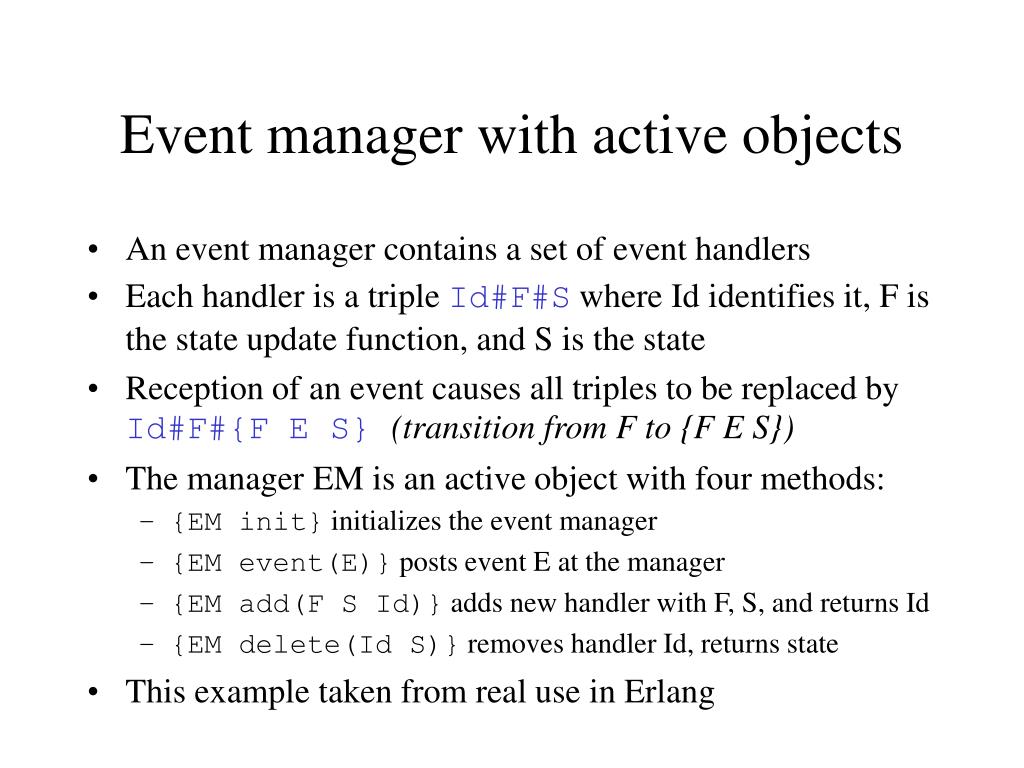 Event manager with active objects • An event manager contains a set of event handlers • Each handler is a triple Id#F#S where Id identifies it, F is the state update function, and S is the state • Reception of an event causes all triples to be replaced by Id#F#{F E S}(transition from F to {F E S}) • The manager EM is an active object with four methods: • {EM init} initializes the event manager • {EM event(E)} posts event E at the manager • {EM add(F S Id)} adds new handler with F, S, and returns Id • {EM delete(Id S)} removes handler Id, returns state • This example taken from real use in Erlang