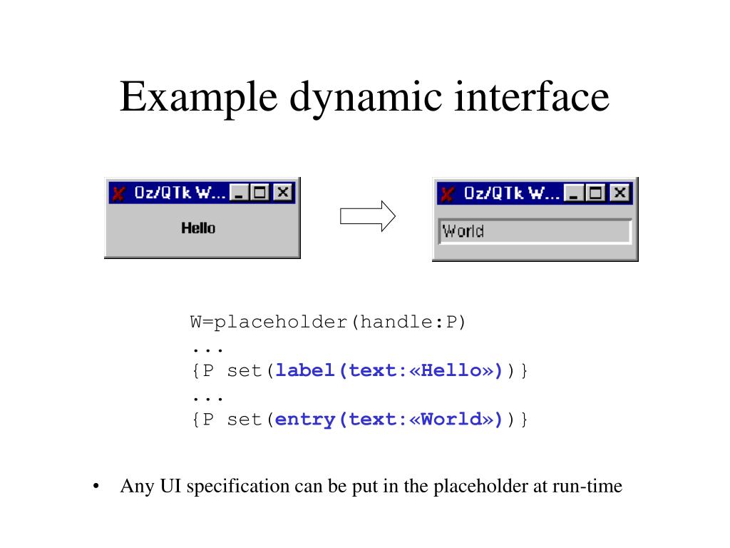 Example dynamic interface • Any UI specification can be put in the placeholder at run-time W=placeholder(handle:P) ... {P set(label(text:«Hello»))} ... {P set(entry(text:«World»))}