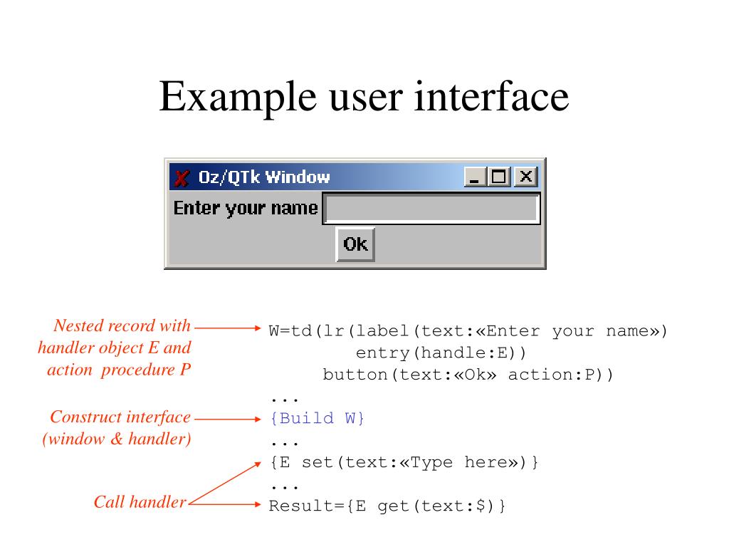 Example user interface Nested record with handler object E and action procedure P W=td(lr(label(text:«Enter your name») entry(handle:E)) button(text:«Ok» action:P)) ... {Build W} ... {E set(text:«Type here»)} ... Result={E get(text:$)} Construct interface (window & handler) Call handler