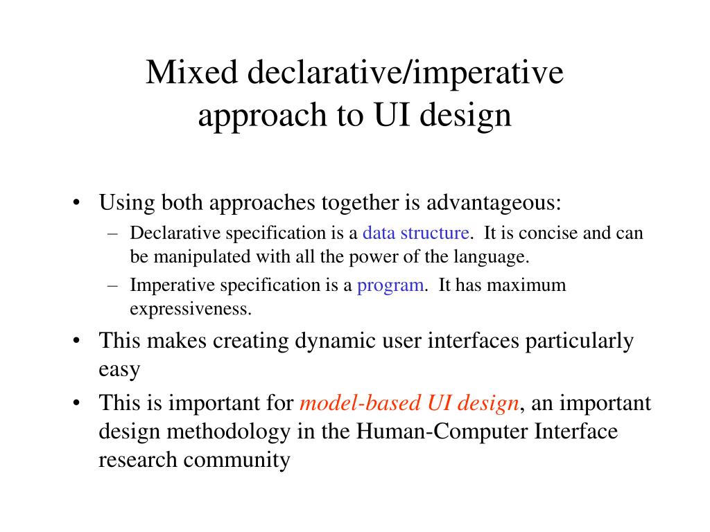 Mixed declarative/imperativeapproach to UI design • Using both approaches together is advantageous: • Declarative specification is a data structure. It is concise and can be manipulated with all the power of the language. • Imperative specification is a program. It has maximum expressiveness. • This makes creating dynamic user interfaces particularly easy • This is important for model-based UI design, an important design methodology in the Human-Computer Interface research community
