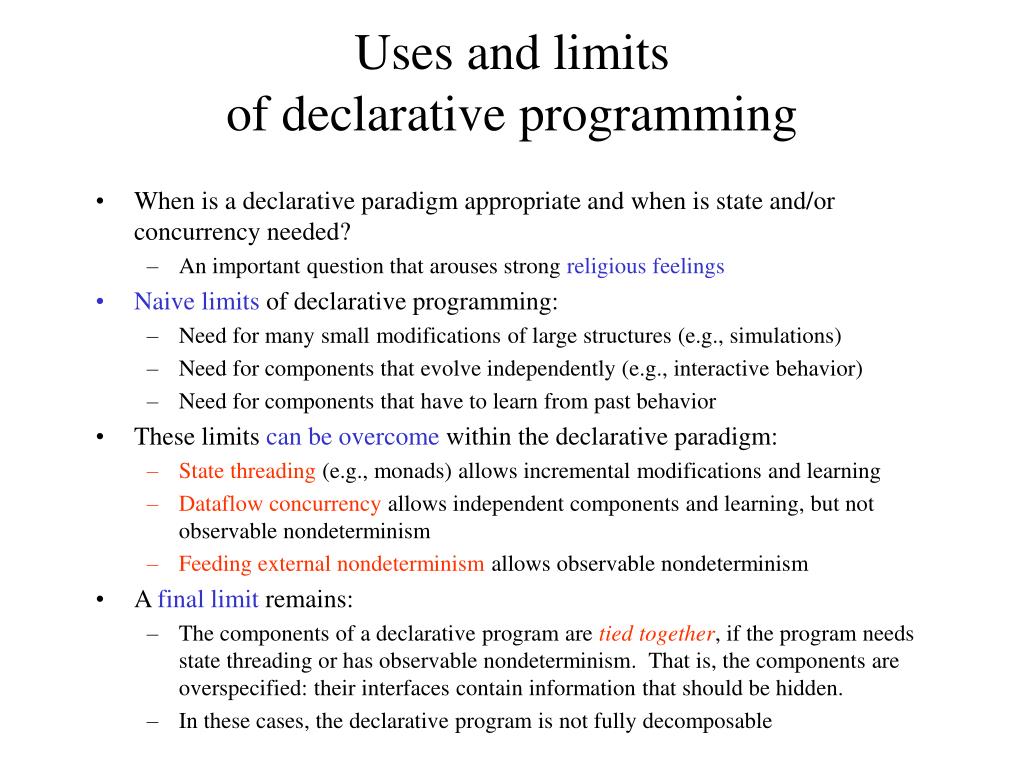 Uses and limitsof declarative programming • When is a declarative paradigm appropriate and when is state and/or concurrency needed? • An important question that arouses strong religious feelings • Naive limits of declarative programming: • Need for many small modifications of large structures (e.g., simulations) • Need for components that evolve independently (e.g., interactive behavior) • Need for components that have to learn from past behavior • These limits can be overcome within the declarative paradigm: • State threading (e.g., monads) allows incremental modifications and learning • Dataflow concurrency allows independent components and learning, but not observable nondeterminism • Feeding external nondeterminism allows observable nondeterminism • A final limit remains: • The components of a declarative program are tied together, if the program needs state threading or has observable nondeterminism. That is, the components are overspecified: their interfaces contain information that should be hidden. • In these cases, the declarative program is not fully decomposable