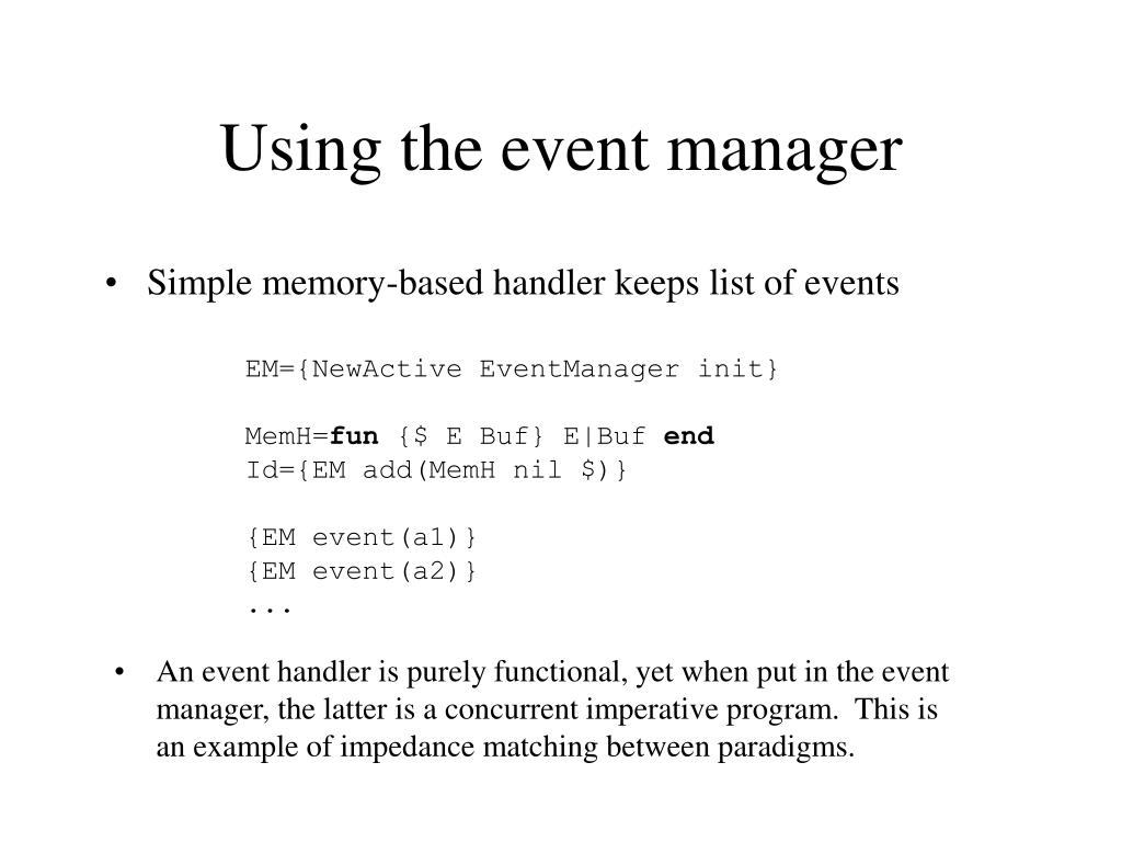 Using the event manager • Simple memory-based handler keeps list of events EM={NewActive EventManager init} MemH=fun {$ E Buf} E|Buf end Id={EM add(MemH nil $)} {EM event(a1)} {EM event(a2)} ... • An event handler is purely functional, yet when put in the event manager, the latter is a concurrent imperative program. This is an example of impedance matching between paradigms.