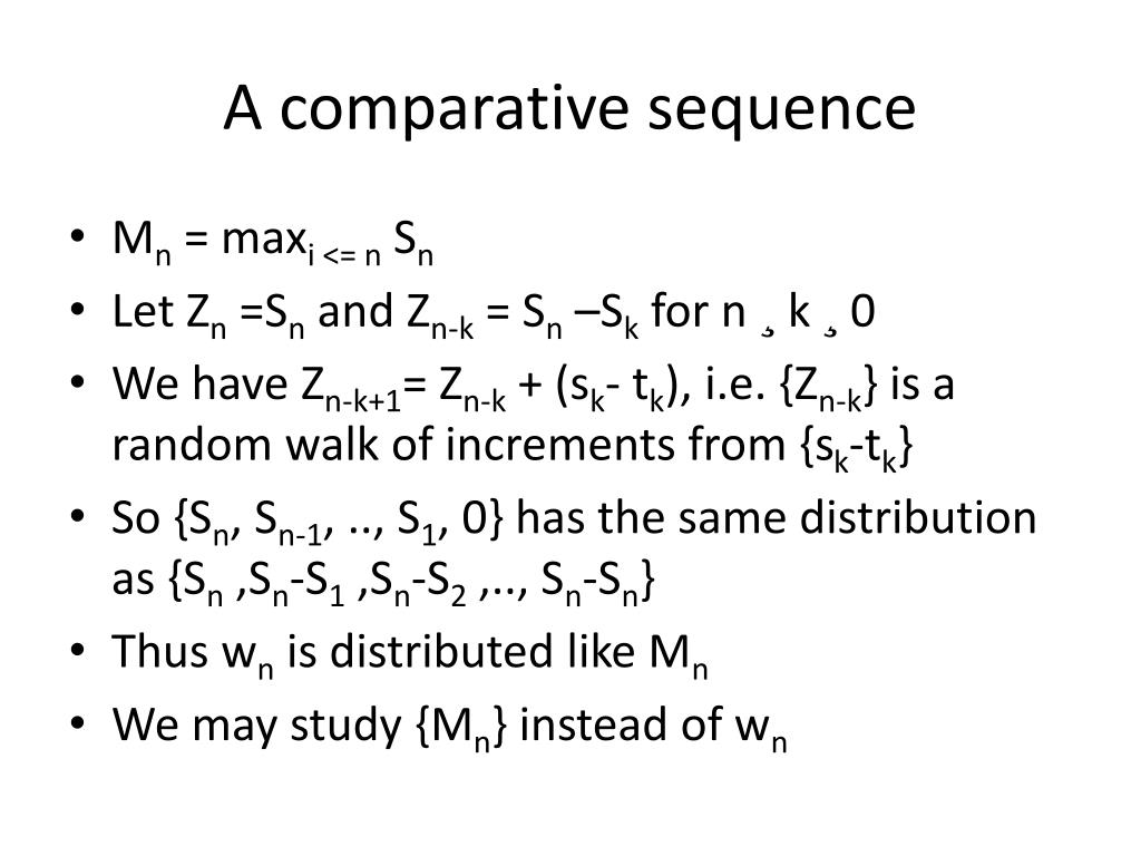 A comparative sequence • Mn = maxi <= n Sn • Let Zn =Sn and Zn-k = Sn –Sk for n ¸ k ¸ 0 • We have Zn-k+1= Zn-k + (sk-tk), i.e. {Zn-k} is a random walk of increments from {sk-tk} • So {Sn, Sn-1, .., S1, 0} has the same distribution as {Sn ,Sn-S1 ,Sn-S2 ,.., Sn-Sn} • Thus wn is distributed like Mn • We may study {Mn} instead of wn