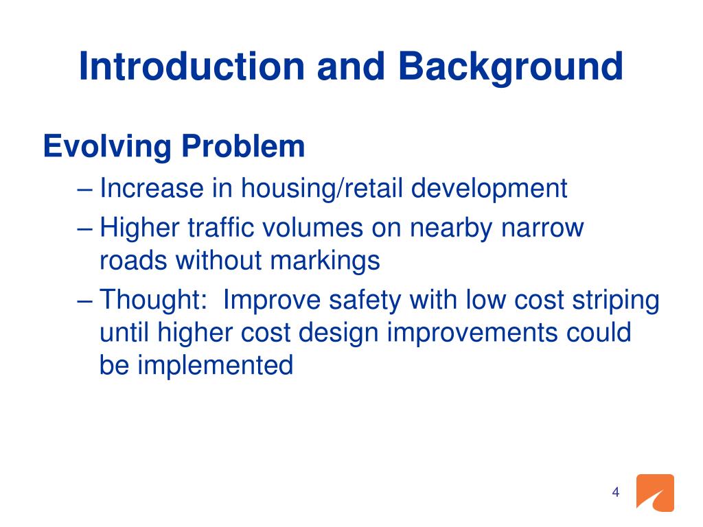 Introduction and Background Evolving Problem • Increase in housing/retail development • Higher traffic volumes on nearby narrow roads without markings • Thought: Improve safety with low cost striping until higher cost design improvements could be implemented