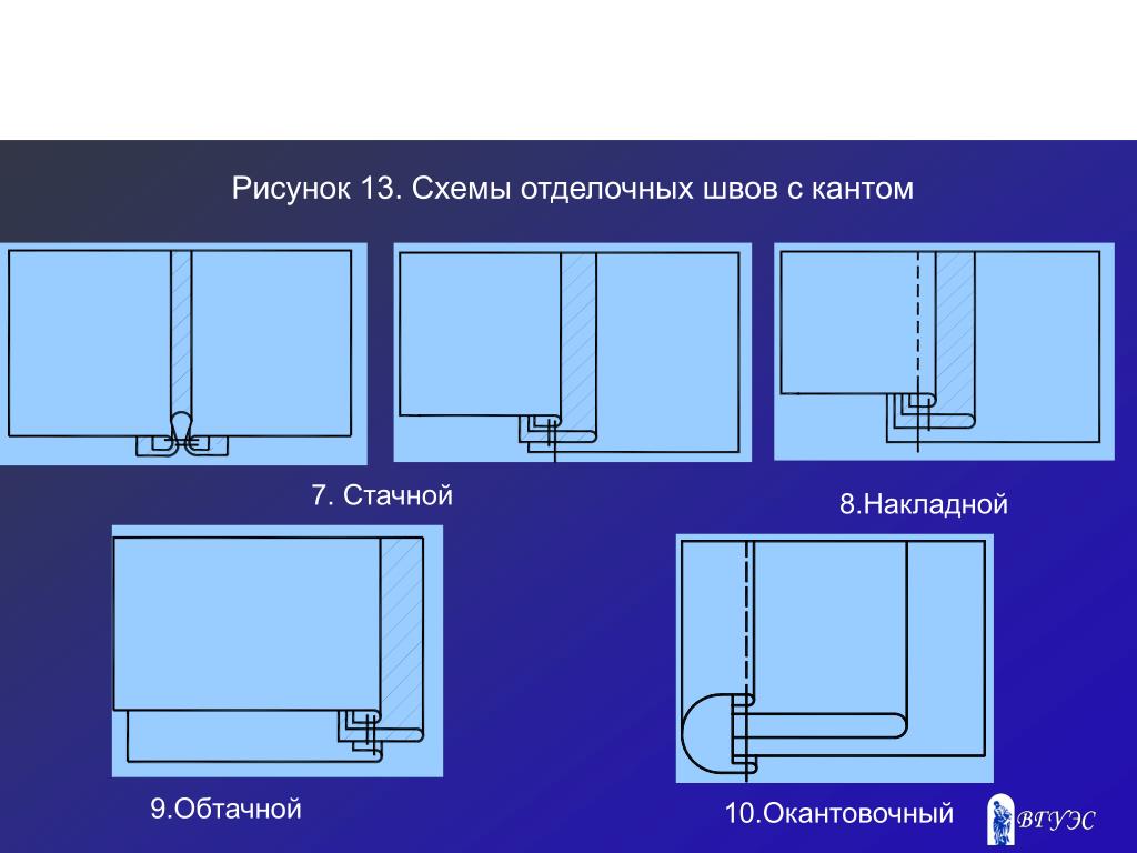 Рисунок 13. Схемы отделочных швов с кантом 7. Стачной 8.Накладной 9.Обтачной 10.Окантовочный