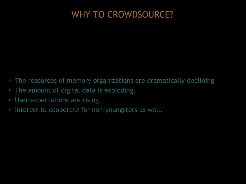 WHY TO CROWDSOURCE? • The resources of memory organizations are dramatically declining • The amount of digital data is exploding. • User expectations are rising. • Interest to cooperate for non-youngsters as well.