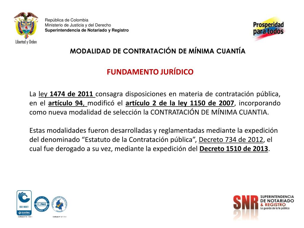 Repúblicade Colombia Ministerio de Justicia y del DerechoSuperintendencia de Notariado y Registro • MODALIDAD DE CONTRATACIÓN DE MÍNIMA CUANTÍA FUNDAMENTO JURÍDICO La ley 1474 de 2011 consagra disposiciones en materia de contratación pública, en el artículo 94, modificó el artículo 2 de la ley 1150 de 2007, incorporando como nueva modalidad de selección la CONTRATACIÓN DE MÍNIMA CUANTIA. Estas modalidades fueron desarrolladas y reglamentadas mediante la expedición del denominado “Estatuto de la Contratación pública”, Decreto 734 de 2012, el cual fue derogado a su vez, mediante la expedición del Decreto 1510 de 2013.