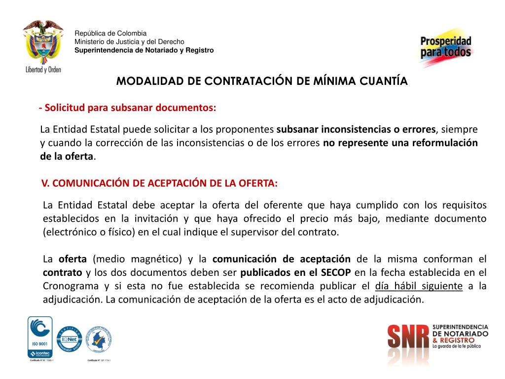 Repúblicade Colombia Ministerio de Justicia y del DerechoSuperintendencia de Notariado y Registro • MODALIDAD DE CONTRATACIÓN DE MÍNIMA CUANTÍA - Solicitud para subsanar documentos: La Entidad Estatal puede solicitar a los proponentes subsanar inconsistencias o errores, siempre y cuando la corrección de las inconsistencias o de los errores no represente una reformulación de la oferta. V. COMUNICACIÓN DE ACEPTACIÓN DE LA OFERTA: La Entidad Estatal debe aceptar la oferta del oferente que haya cumplido con los requisitos establecidos en la invitación y que haya ofrecido el precio más bajo, mediante documento (electrónico o físico) en el cual indique el supervisor del contrato. La oferta (medio magnético) y la comunicación de aceptación de la misma conforman el contrato y los dos documentos deben ser publicados en el SECOP en la fecha establecida en el Cronograma y si esta no fue establecida se recomienda publicar el día hábil siguiente a la adjudicación. La comunicación de aceptación de la oferta es el acto de adjudicación.