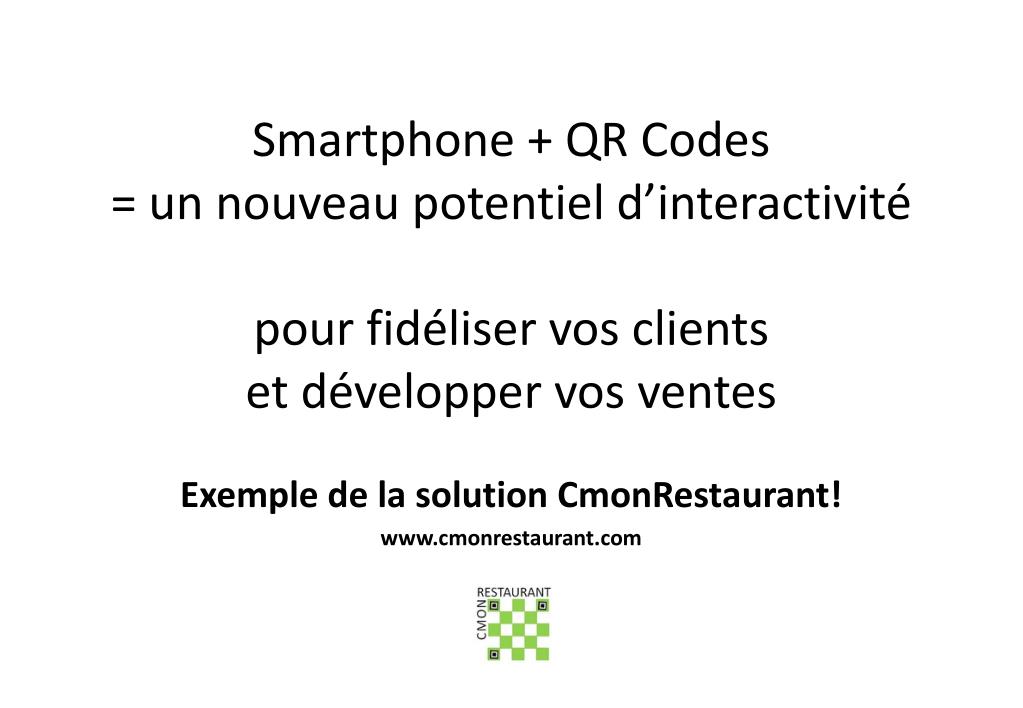 Smartphone + QR Codes = un nouveau potentiel d’interactivité pour fidéliser vos clients et développer vos ventes . Exemple de la solution CmonRestaurant ! www.cmonrestaurant.com. Utilisation du smartphone au restaurant : une opportunité de communication à saisir.