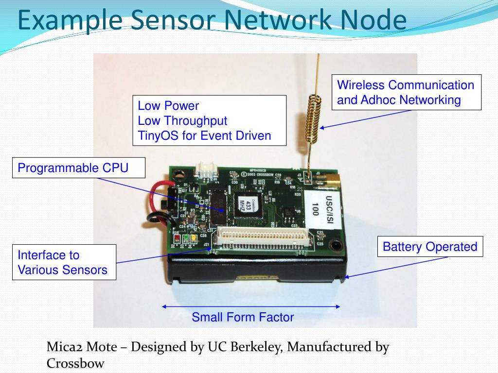 Example Sensor Network Node Wireless Communication and Adhoc Networking Low PowerLow Throughput TinyOS for Event Driven Programmable CPU Battery Operated Interface to Various Sensors Small Form Factor Mica2 Mote – Designed by UC Berkeley, Manufactured by Crossbow