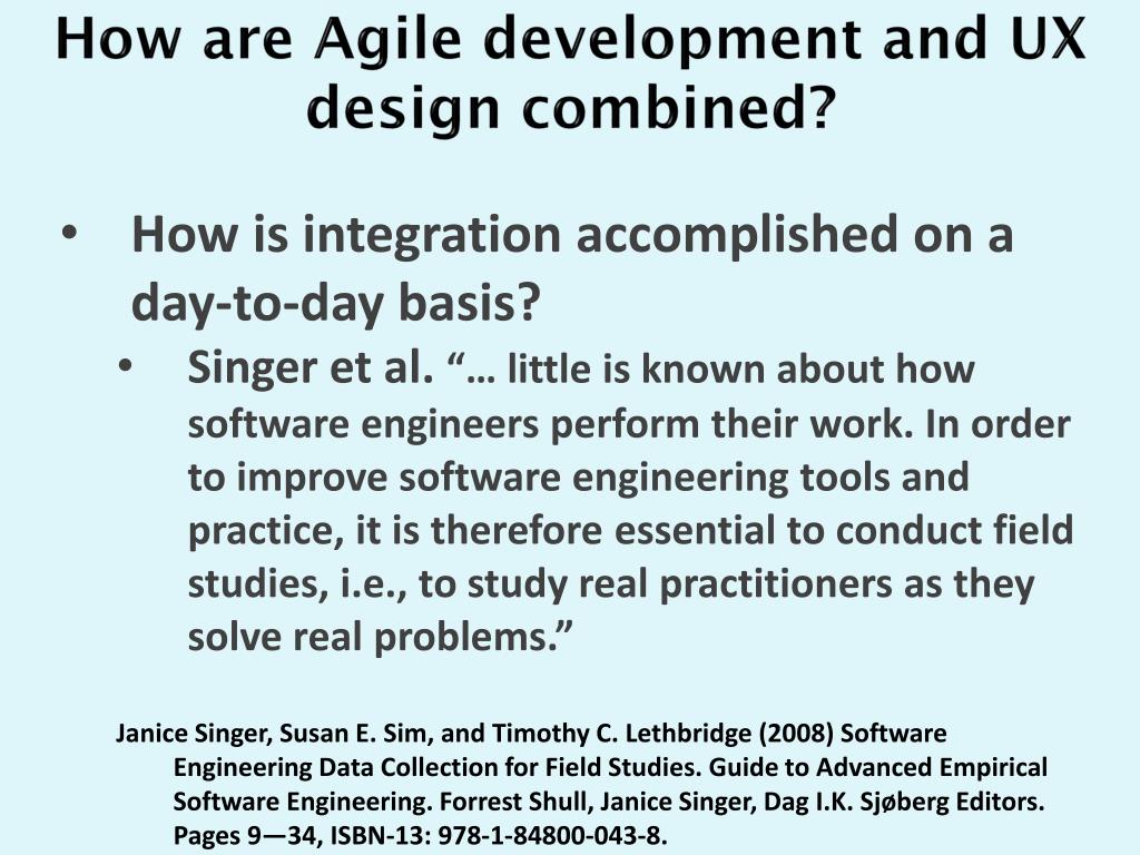 How are Agile development and UX design combined? • How is integration accomplished on a day-to-day basis? • Singer et al. “… little is known about how software engineers perform their work. In order to improve software engineering tools and practice, it is therefore essential to conduct field studies, i.e., to study real practitioners as they solve real problems.” • Janice Singer, Susan E. Sim, and Timothy C. Lethbridge (2008) Software Engineering Data Collection for Field Studies. Guide to Advanced Empirical Software Engineering. Forrest Shull, Janice Singer, Dag I.K. Sjøberg Editors. Pages 9—34, ISBN-13: 978-1-84800-043-8.