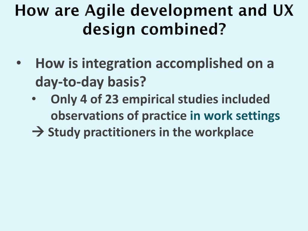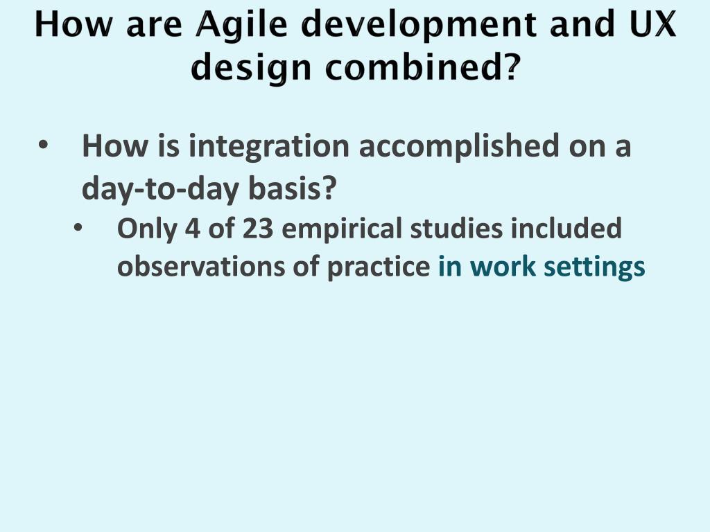 How are Agile development and UX design combined? • How is integration accomplished on a day-to-day basis? • Only 4 of 23 empirical studies included observations of practice in work settings