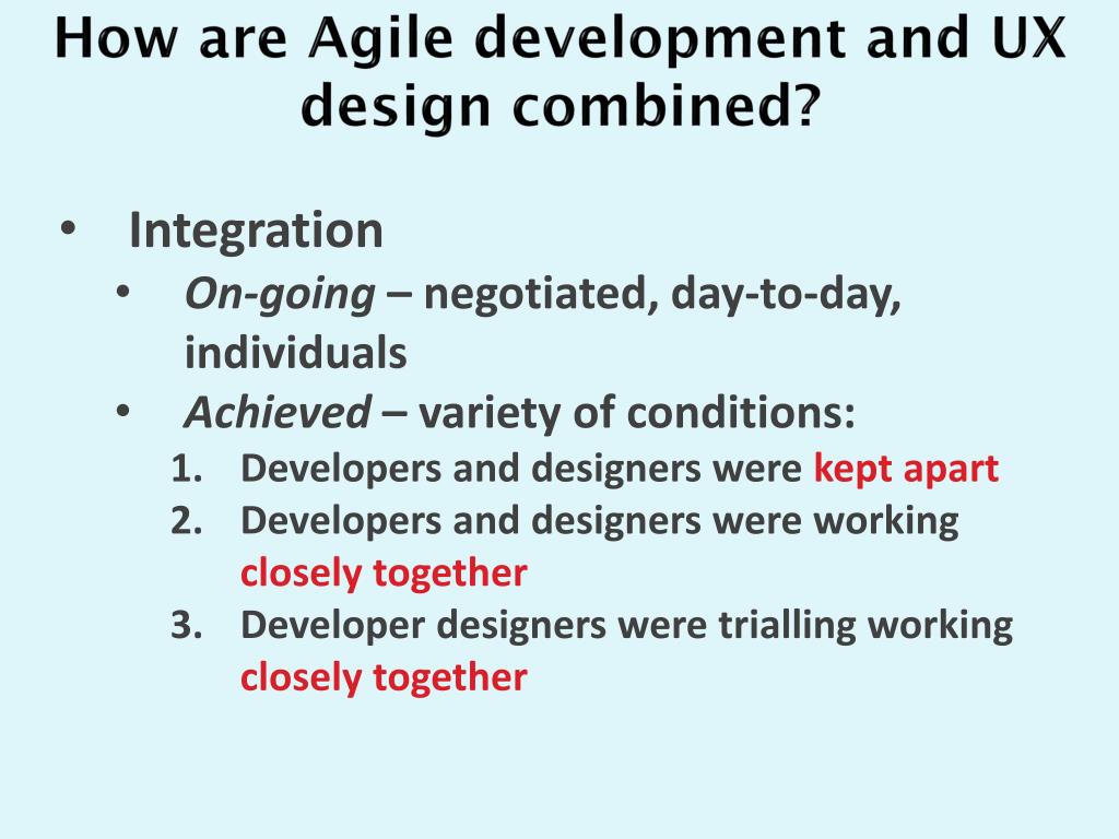 How are Agile development and UX design combined? • Integration • On-going – negotiated, day-to-day, individuals • Achieved – variety of conditions: • Developers and designers were kept apart • Developers and designers were working closely together • Developer designers were trialling working closely together