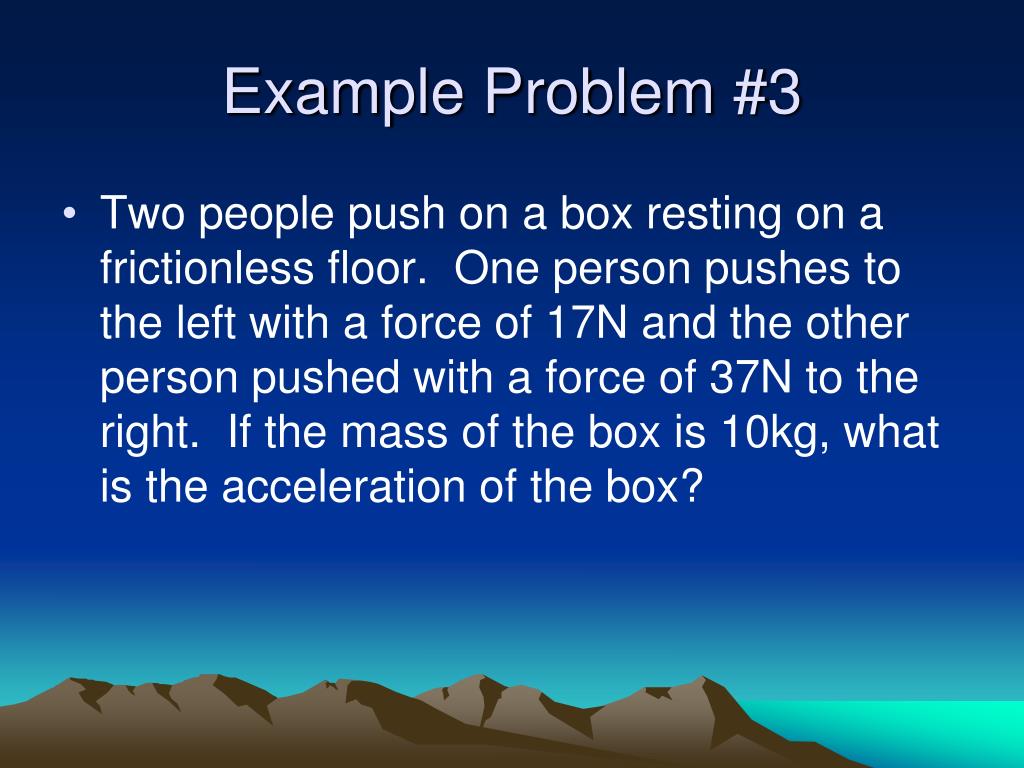 Example Problem #3 • Two people push on a box resting on a frictionless floor. One person pushes to the left with a force of 17N and the other person pushed with a force of 37N to the right. If the mass of the box is 10kg, what is the acceleration of the box?