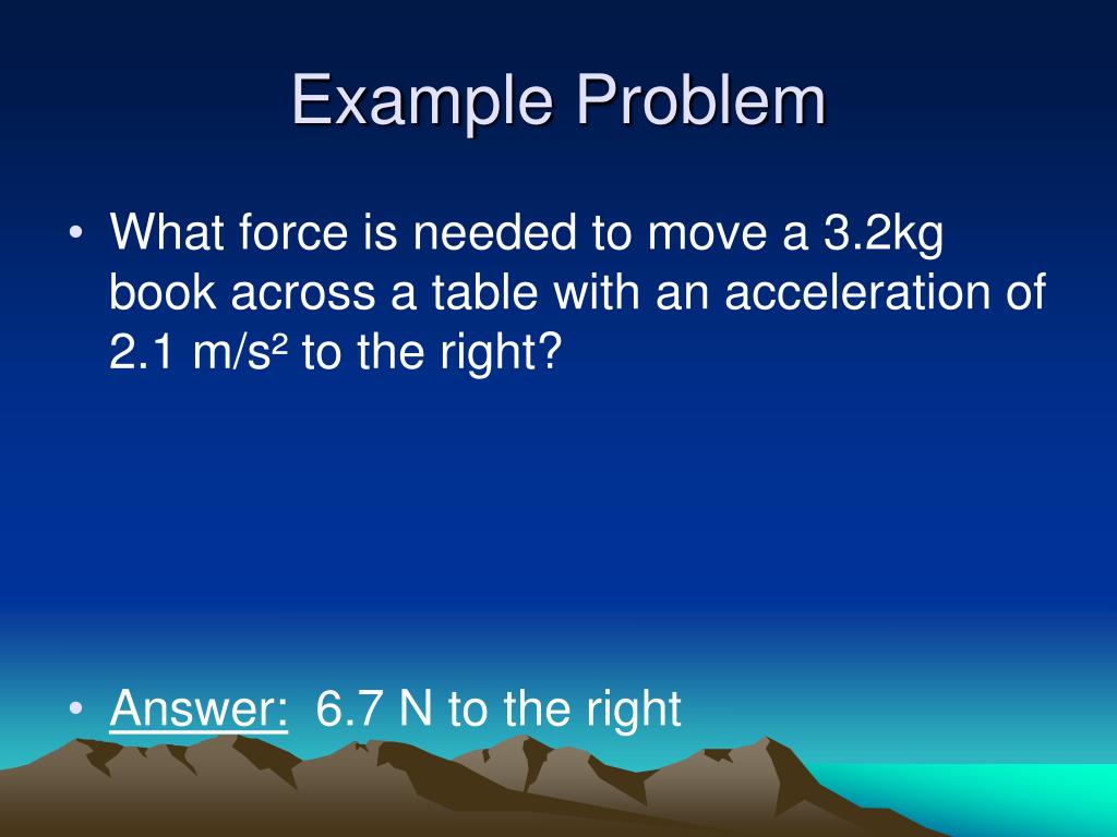 Example Problem • What force is needed to move a 3.2kg book across a table with an acceleration of 2.1 m/s² to the right? • Answer: 6.7 N to the right