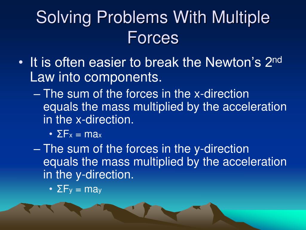 Solving Problems With Multiple Forces • It is often easier to break the Newton’s 2nd Law into components. • The sum of the forces in the x-direction equals the mass multiplied by the acceleration in the x-direction. • ΣFx = max • The sum of the forces in the y-direction equals the mass multiplied by the acceleration in the y-direction. • ΣFy = may