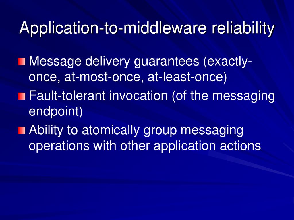 Application-to-middleware reliability • Message delivery guarantees (exactly-once, at-most-once, at-least-once) • Fault-tolerant invocation (of the messaging endpoint) • Ability to atomically group messaging operations with other application actions