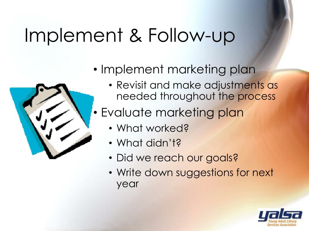 Implement & Follow-up • Implement marketing plan • Revisit and make adjustments as needed throughout the process • Evaluate marketing plan • What worked? • What didn’t? • Did we reach our goals? • Write down suggestions for next year