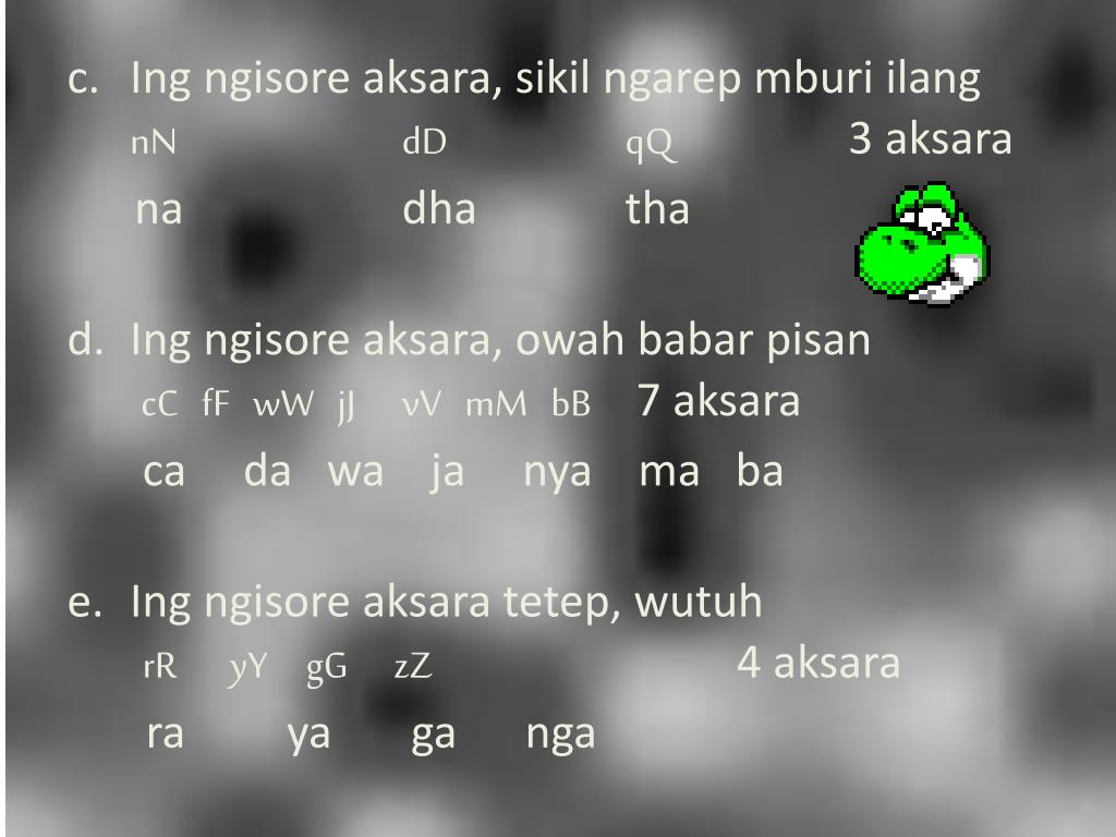 Ingngisoreaksara, sikilngarepmburiilang nNdDqQ 3 aksara nadhatha • Ingngisoreaksara, owahbabarpisan cCfFwWjJvVmMbB 7 aksara ca dawajanya ma ba • Ingngisoreaksaratetep, wutuh rRyYgGzZ 4 aksara rayaganga
