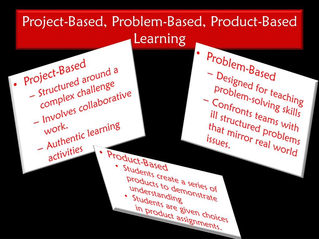 Project-Based, Problem-Based, Product-Based Learning • Project-Based • Structured around a complex challenge • Involves collaborative work. • Authentic learning activities • Problem-Based • Designed for teaching problem-solving skills • Confronts teams with ill structured problems that mirror real world issues. • Product-Based • Students create a series of products to demonstrate understanding • Students are given choices in product assignments.