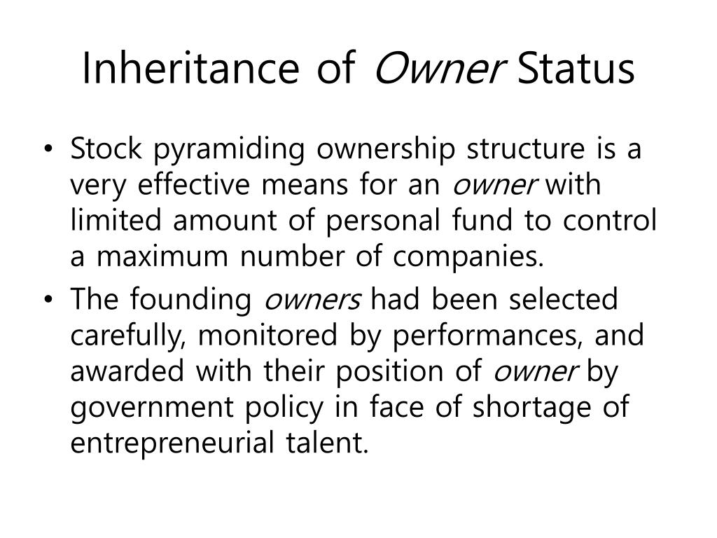 Inheritance of Owner Status • Stock pyramiding ownership structure is a very effective means for an owner with limited amount of personal fund to control a maximum number of companies. • The founding owners had been selected carefully, monitored by performances, and awarded with their position of owner by government policy in face of shortage of entrepreneurial talent.