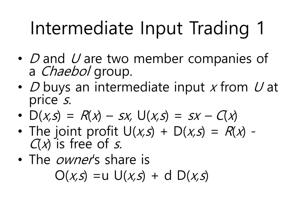 Intermediate Input Trading 1 • D and U are two member companies of a Chaebolgroup. • D buys an intermediate input x from U at price s. • D(x,s) = R(x) – sx, U(x,s) = sx – C(x) • The joint profit U(x,s) + D(x,s) = R(x) - C(x) is free of s. • The owner’s share is O(x,s) =u U(x,s) + d D(x,s)