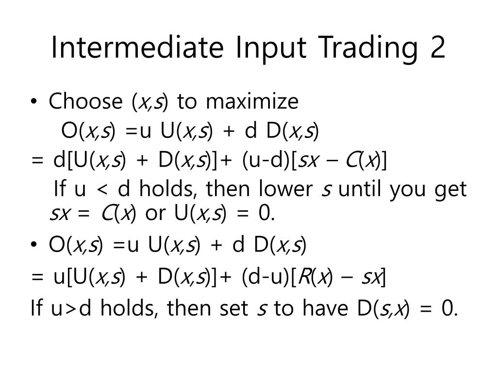 Intermediate Input Trading 2 • Choose (x,s) to maximize O(x,s) =u U(x,s) + d D(x,s) = d[U(x,s) + D(x,s)]+ (u-d)[sx – C(x)] If u < d holds, then lower s until you get sx= C(x) or U(x,s) = 0. • O(x,s) =u U(x,s) + d D(x,s) = u[U(x,s) + D(x,s)]+ (d-u)[R(x) – sx] If u>d holds, then set s to have D(s,x) = 0.