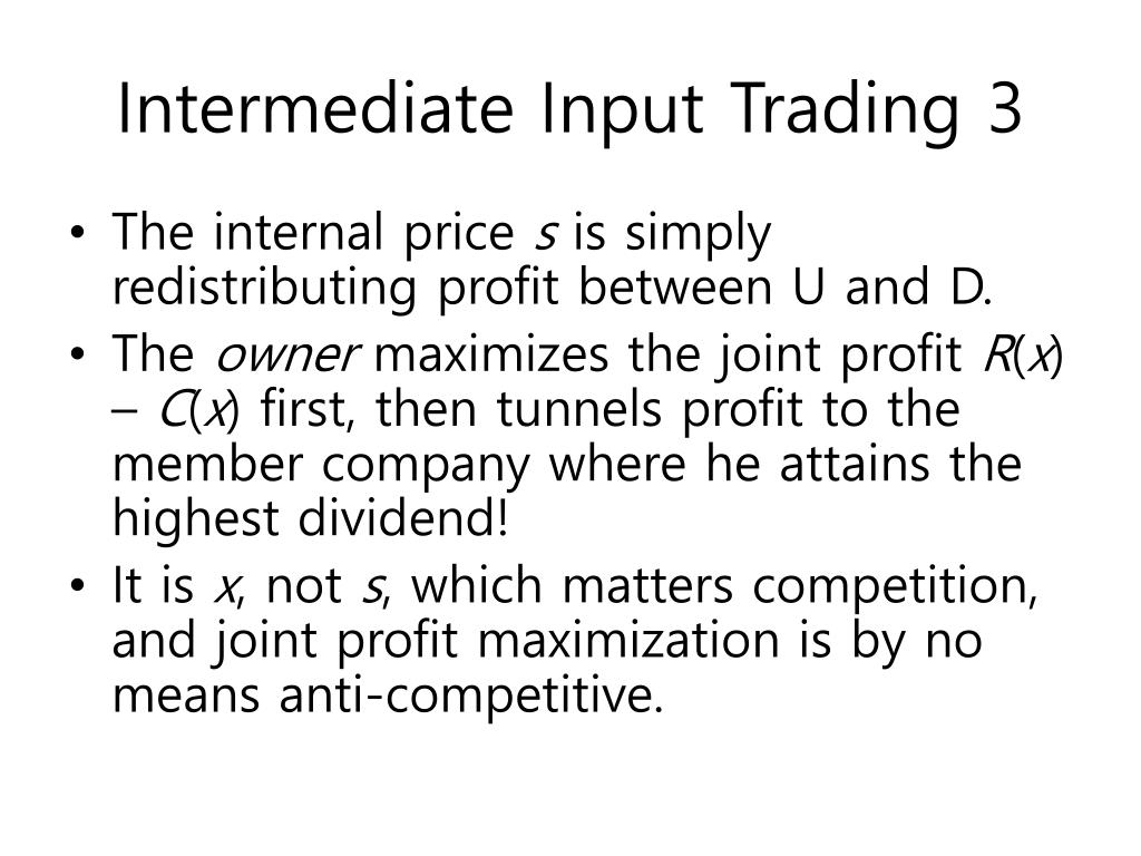 Intermediate Input Trading 3 • The internal price s is simply redistributing profit between U and D. • The owner maximizes the joint profit R(x) – C(x) first, then tunnels profit to the member company where he attains the highest dividend! • It is x, not s, which matters competition, and joint profit maximization is by no means anti-competitive.