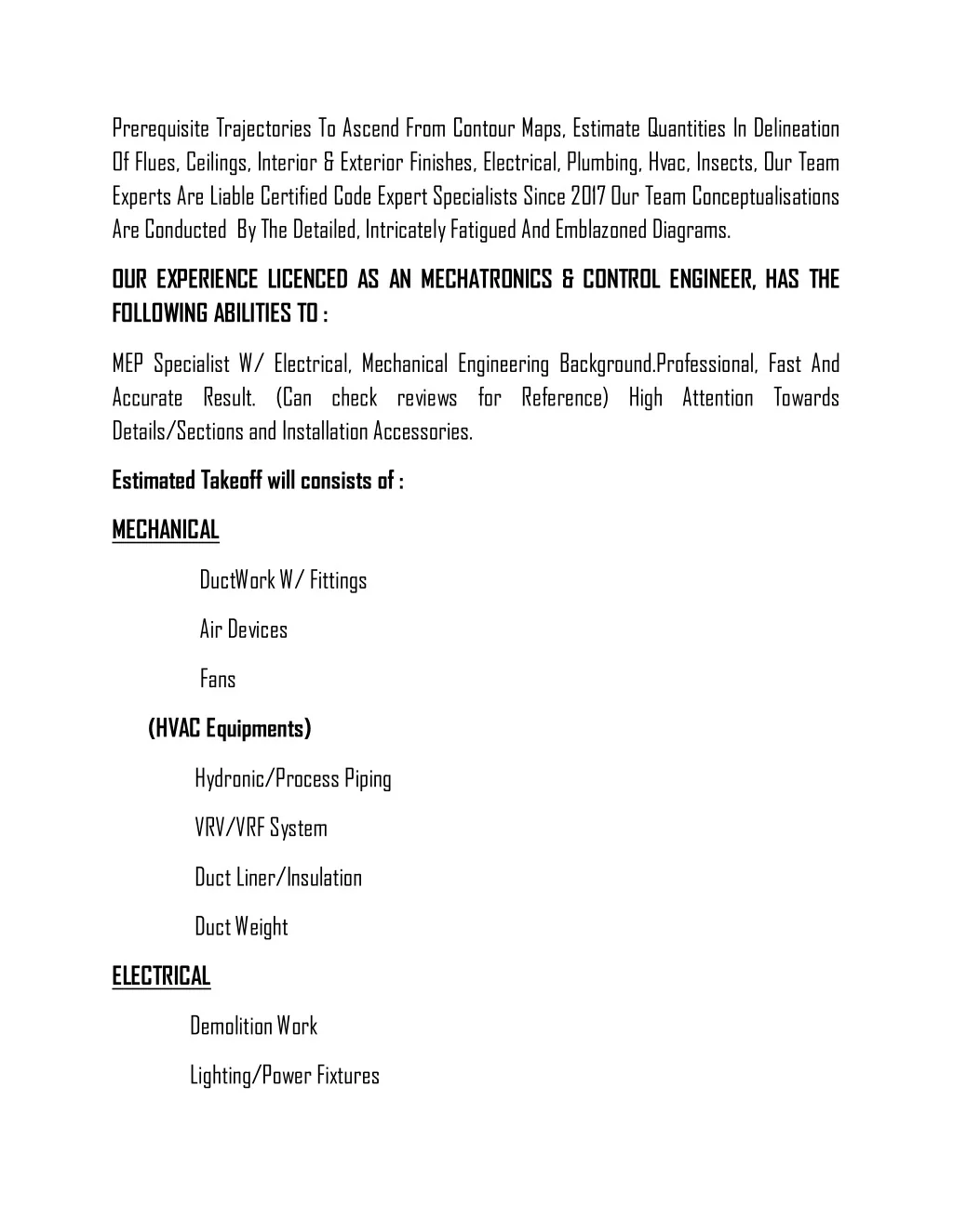 Prerequisite Trajectories To Ascend From Contour Maps, Estimate Quantities In Delineation Of Flues, Ceilings, Interior & Exterior Finishes, Electrical, Plumbing, Hvac, Insects, Our Team Experts Are Liable Certified Code Expert Specialists Since 2017 Our Team Conceptualisations Are Conducted By The Detailed, Intricately Fatigued And Emblazoned Diagrams. OUR EXPERIENCE LICENCED AS AN MECHATRONICS & CONTROL ENGINEER, HAS THE FOLLOWING ABILITIES TO : MEP Specialist W/ Electrical, Mechanical Engineering Background.Professional, Fast And Accurate Result. (Can check reviews for Reference) High Attention Towards Details/Sections and Installation Accessories. Estimated Takeoff will consists of : MECHANICAL DuctWork W/ Fittings Air Devices Fans (HVAC Equipments) Hydronic/Process Piping VRV/VRF System Duct Liner/Insulation Duct Weight ELECTRICAL Demolition Work Lighting/Power Fixtures