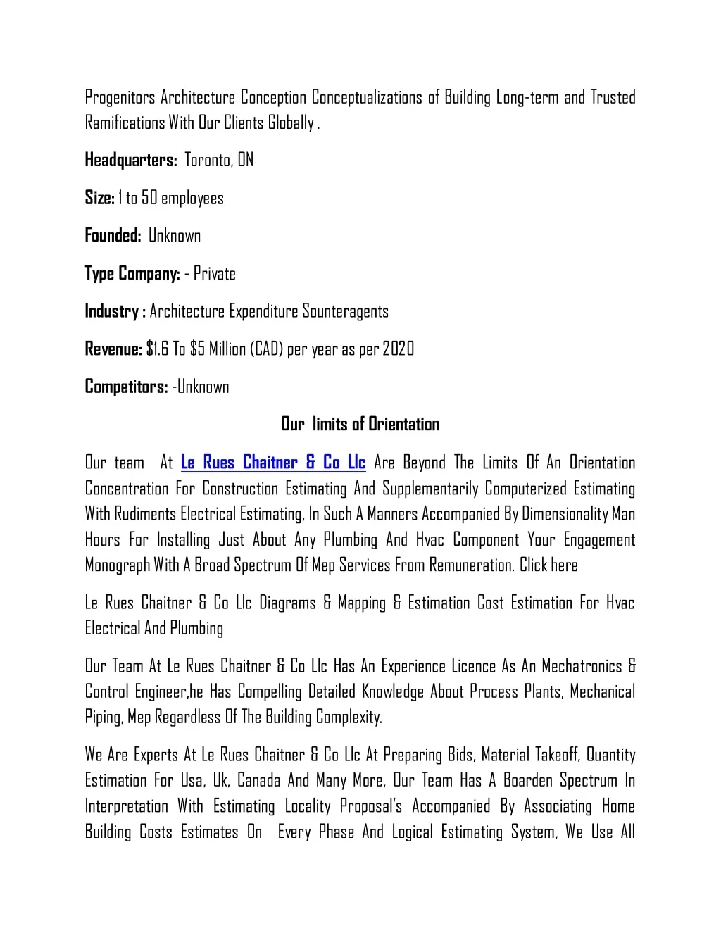Progenitors Architecture Conception Conceptualizations of Building Long-term and Trusted Ramifications With Our Clients Globally . Headquarters: Toronto, ON Size: 1 to 50 employees Founded: Unknown Type Company: - Private Industry : Architecture Expenditure Sounteragents Revenue: $1.6 To $5 Million (CAD) per year as per 2020 Competitors: -Unknown Our limits of Orientation Our team At Le Rues Chaitner & Co Llc Are Beyond The Limits Of An Orientation Concentration For Construction Estimating And Supplementarily Computerized Estimating With Rudiments Electrical Estimating, In Such A Manners Accompanied By Dimensionality Man Hours For Installing Just About Any Plumbing And Hvac Component Your Engagement Monograph With A Broad Spectrum Of Mep Services From Remuneration. Click here Le Rues Chaitner & Co Llc Diagrams & Mapping & Estimation Cost Estimation For Hvac Electrical And Plumbing Our Team At Le Rues Chaitner & Co Llc Has An Experience Licence As An Mechatronics & Control Engineer,he Has Compelling Detailed Knowledge About Process Plants, Mechanical Piping, Mep Regardless Of The Building Complexity. We Are Experts At Le Rues Chaitner & Co Llc At Preparing Bids, Material Takeoff, Quantity Estimation For Usa, Uk, Canada And Many More, Our Team Has A Boarden Spectrum In Interpretation With Estimating Locality Proposal’s Accompanied By Associating Home Building Costs Estimates On Every Phase And Logical Estimating System, We Use All
