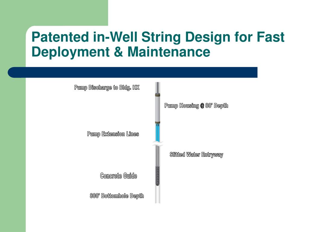 Patented in-Well String Design for Fast Deployment & Maintenance Pump Discharge to Bldg. HX Pump Housing @ 80' Depth Pump Extension Lines Slitted Water Entryway Concrete Guide 800' Bottomhole Depth