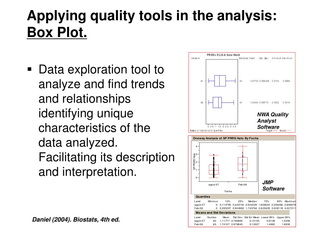 Applying quality tools in the analysis: Box Plot. • Data exploration tool to analyze and find trends and relationships identifying unique characteristics of the data analyzed. Facilitating its description and interpretation. NWA Quality Analyst Software JMP Software Daniel (2004). Biostats, 4th ed.