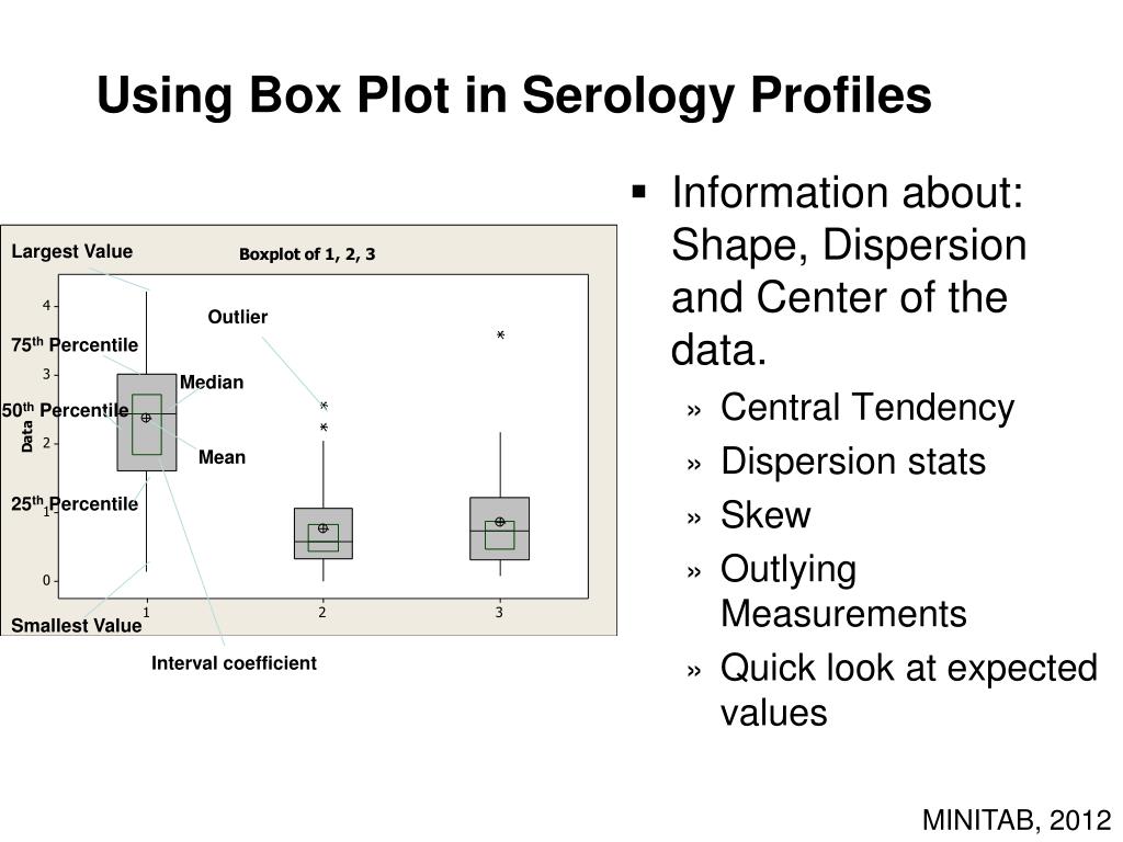 Using Box Plot in Serology Profiles • Information about: Shape, Dispersion and Center of the data. • Central Tendency • Dispersion stats • Skew • Outlying Measurements • Quick look at expected values Largest Value Outlier 75th Percentile Median 50th Percentile Mean 25th Percentile Smallest Value Interval coefficient MINITAB, 2012