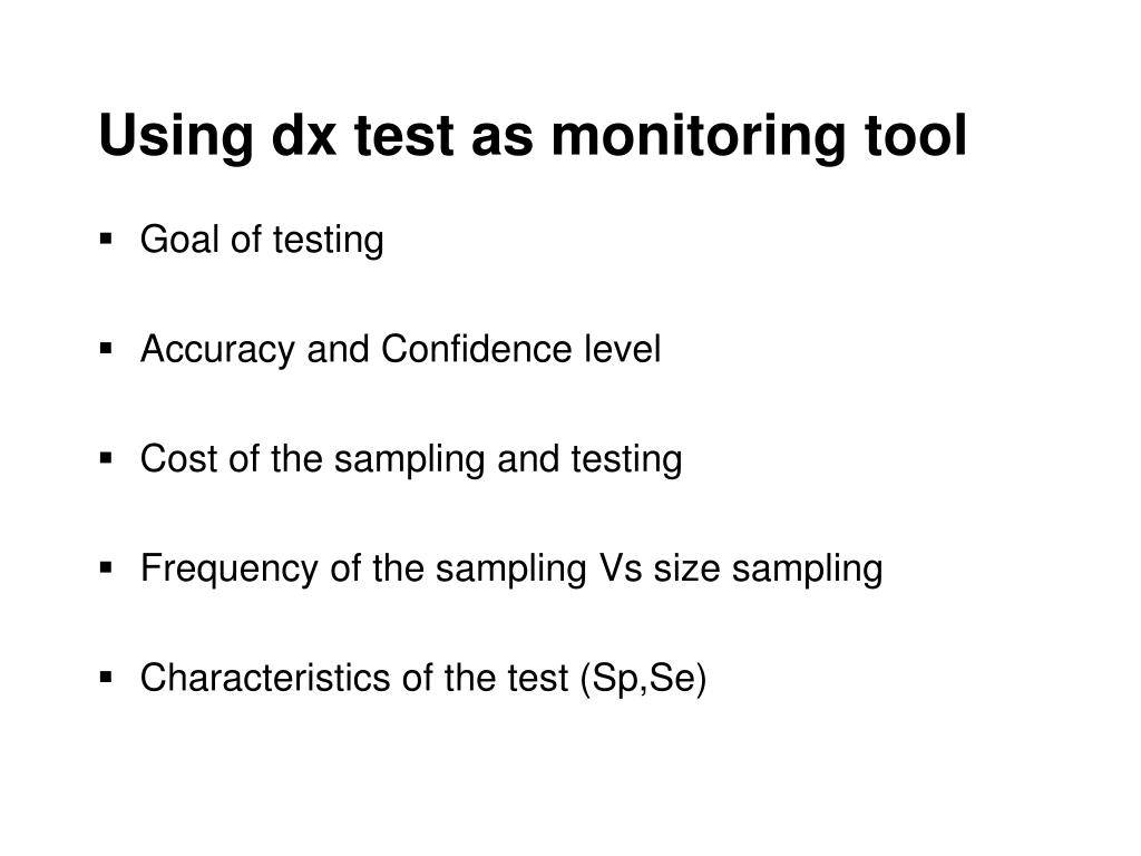 Using dx test as monitoring tool • Goal of testing • Accuracy and Confidence level • Cost of the sampling and testing • Frequency of the sampling Vs size sampling • Characteristics of the test (Sp,Se)