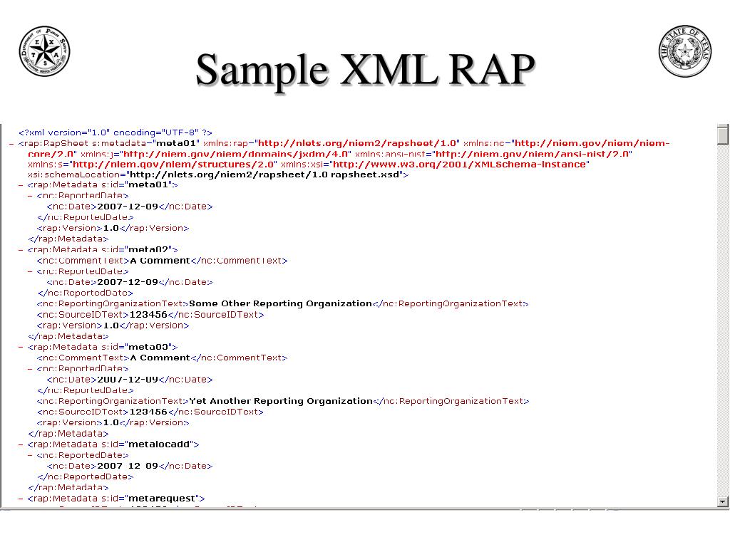 Impact to Criminal Justice Agencies • Text RAP will still exist, but format may change • In the future: • the RAP can be transmitted as an XML document to the local criminal justice agency • Or Not (State will continue to provide a Text Format) • TxDPS will contribute a style sheet to format the RAP XML document as a PDF file.