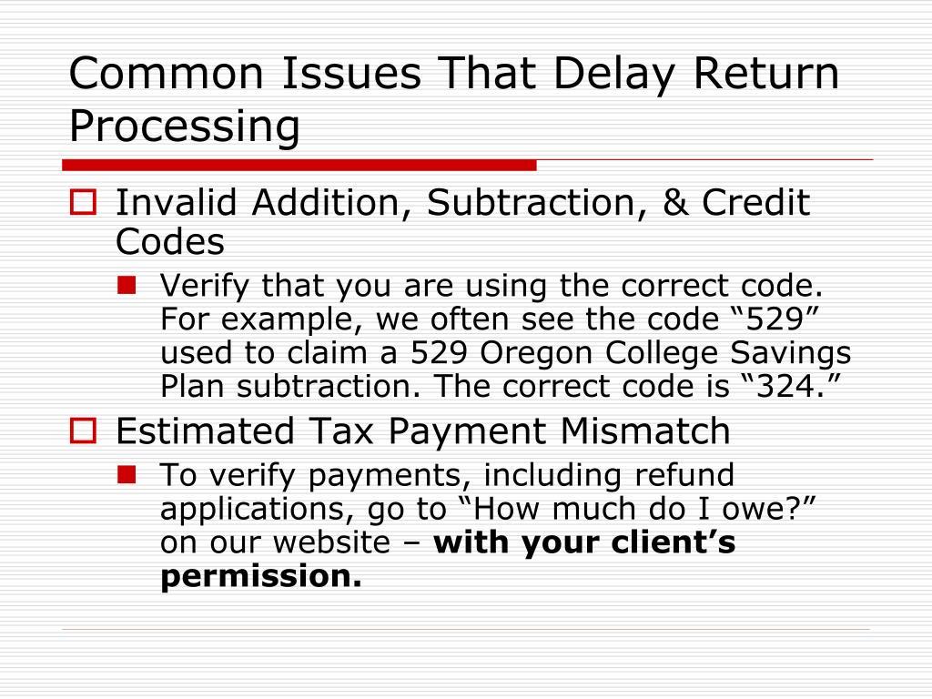 Common Issues That Delay Return Processing Invalid Addition, Subtraction, & Credit Codes Verify that you are using the correct code. For example, we often see the code “529” used to claim a 529 Oregon College Savings Plan subtraction. The correct code is “324.” Estimated Tax Payment Mismatch To verify payments, including refund applications, go to “How much do I owe?” on our website – with your client’s permission.