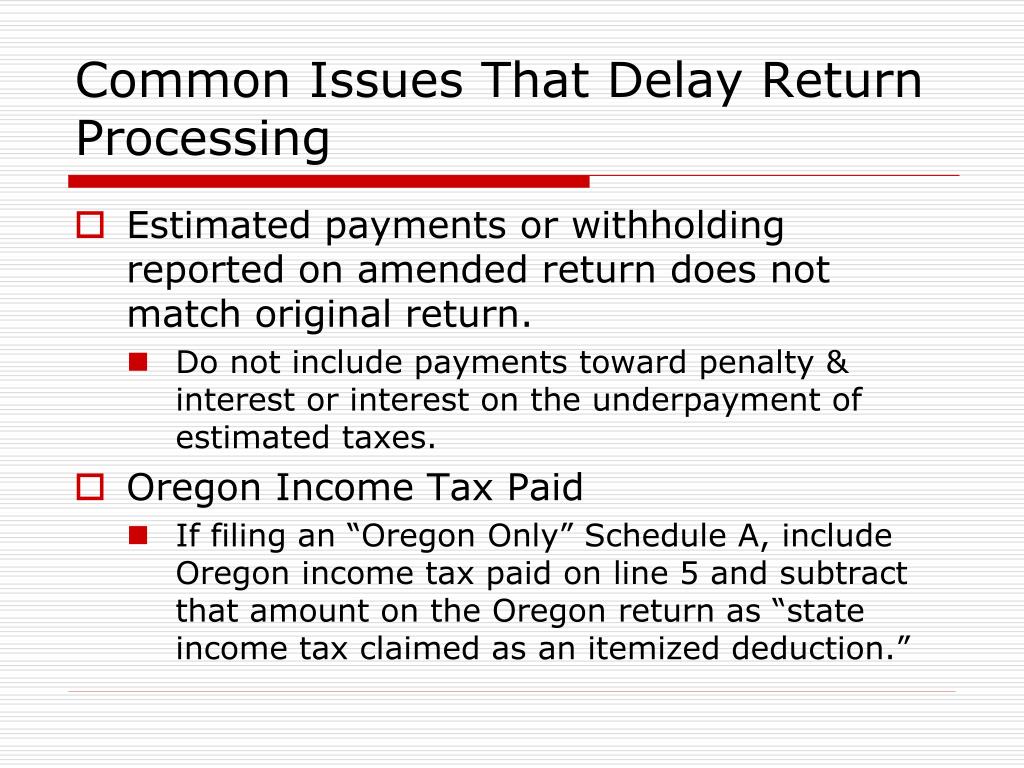 Common Issues That Delay Return Processing • Estimated payments or withholding reported on amended return does not match original return. • Do not include payments toward penalty & interest or interest on the underpayment of estimated taxes. • Oregon Income Tax Paid • If filing an “Oregon Only” Schedule A, include Oregon income tax paid on line 5 and subtract that amount on the Oregon return as “state income tax claimed as an itemized deduction.”
