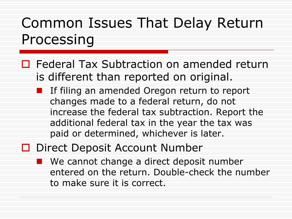Common Issues That Delay Return Processing • Federal Tax Subtraction on amended return is different than reported on original. • If filing an amended Oregon return to report changes made to a federal return, do not increase the federal tax subtraction. Report the additional federal tax in the year the tax was paid or determined, whichever is later. • Direct Deposit Account Number • We cannot change a direct deposit number entered on the return. Double-check the number to make sure it is correct.