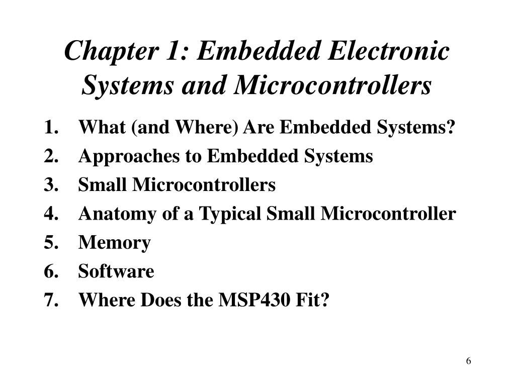 Chapter 1: Embedded Electronic Systems and Microcontrollers • What (and Where) Are Embedded Systems? • Approaches to Embedded Systems • Small Microcontrollers • Anatomy of a Typical Small Microcontroller • Memory • Software • Where Does the MSP430 Fit?