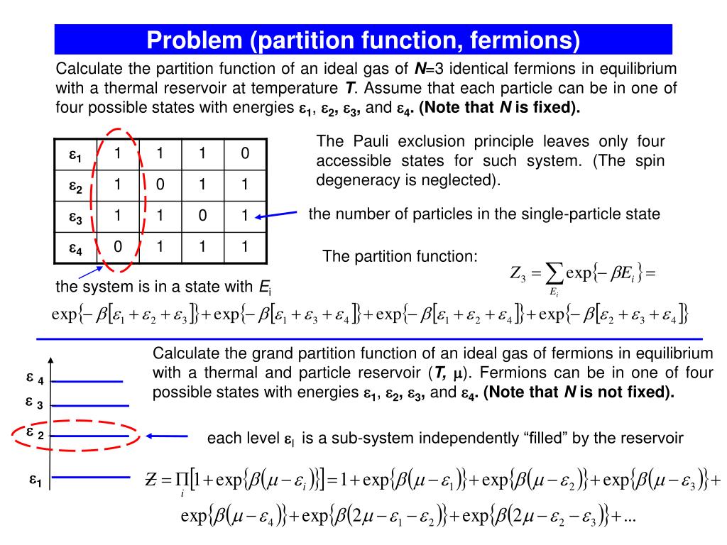 Problem (partition function, fermions) Calculate the partition function of an ideal gas of N=3 identical fermions in equilibrium with a thermal reservoir at temperature T. Assume that each particle can be in one of four possible states with energies 1, 2, 3, and 4. (Note that N is fixed). The Pauli exclusion principle leaves only four accessible states for such system. (The spin degeneracy is neglected). the number of particles in the single-particle state The partition function: the system is in a state with Ei Calculate the grand partition function of an ideal gas of fermions in equilibrium with a thermal and particle reservoir (T, ). Fermions can be in one of four possible states with energies 1, 2, 3, and 4. (Note that N is not fixed). 4 3 2 each level I is a sub-system independently “filled” by the reservoir 1