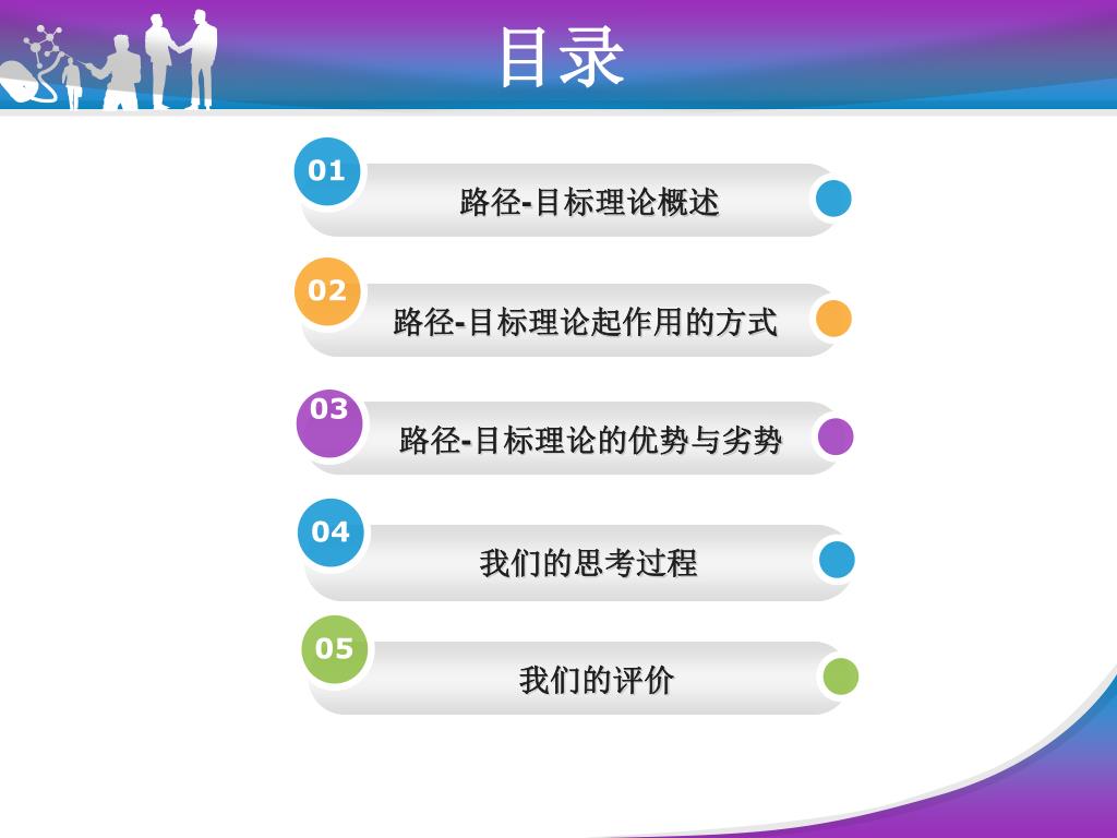 目录 01 路径-目标理论概述 02 路径-目标理论起作用的方式 03 路径-目标理论的优势与劣势 04 我们的思考过程 05 我们的评价