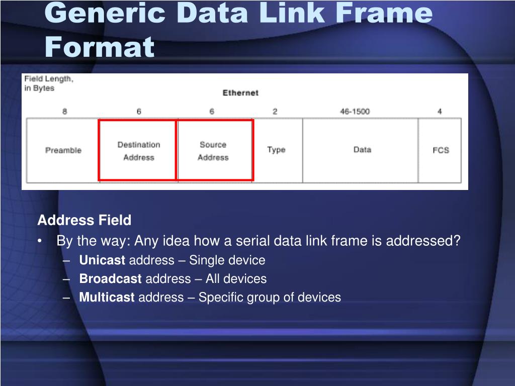 Generic Data Link Frame Format Address Field • By the way: Any idea how a serial data link frame is addressed? • Unicast address – Single device • Broadcast address – All devices • Multicast address – Specific group of devices