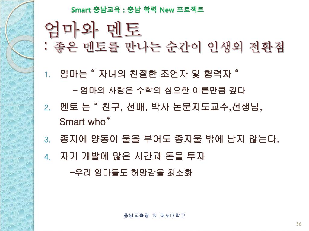 Smart 충남교육 : 충남 학력 New 프로젝트 엄마와 멘토 : 좋은 멘토를 만나는 순간이 인생의 전환점 • 엄마는 “ 자녀의 친절한 조언자 및 협력자 “ – 엄마의 사랑은 수학의 심오한 이론만큼 깊다 • 멘토 는 “ 친구, 선배, 박사 논문지도교수,선생님, Smart who” • 종지에양동이 물을 부어도 종지물 밖에 남지 않는다. • 자기 개발에 많은 시간과 돈을 투자 –우리 엄마들도 허망감을 최소화 충남교육청 & 호서대학교