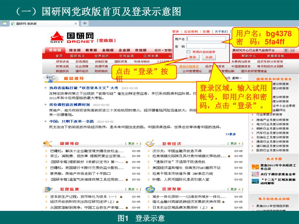 (一)国研网党政版首页及登录示意图 用户名:bg4378 密 码:5fa4ff b 点击“登录”按钮 登录区域,输入试用帐号,即用户名和密码,点击“登录”。 图1 登录示意